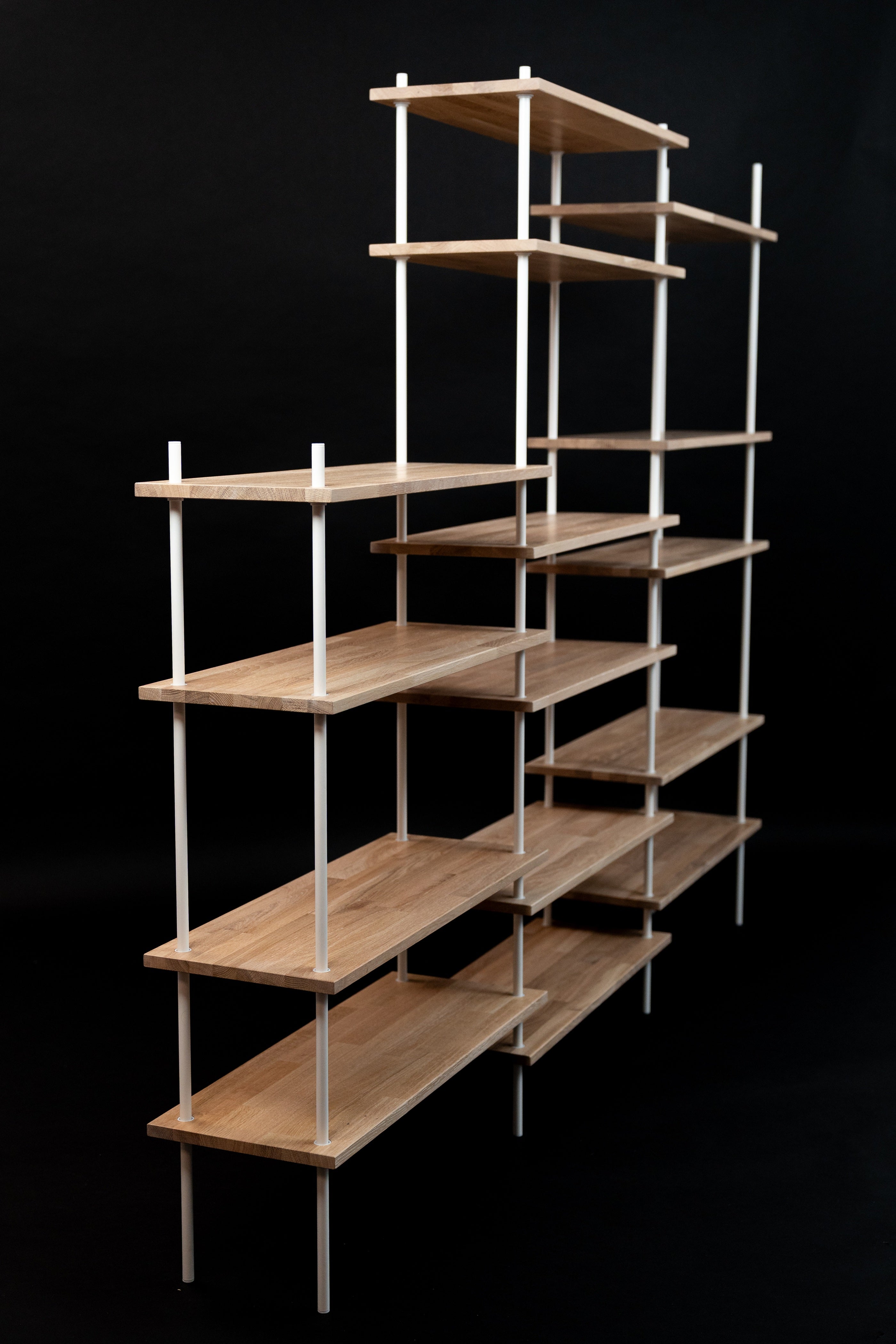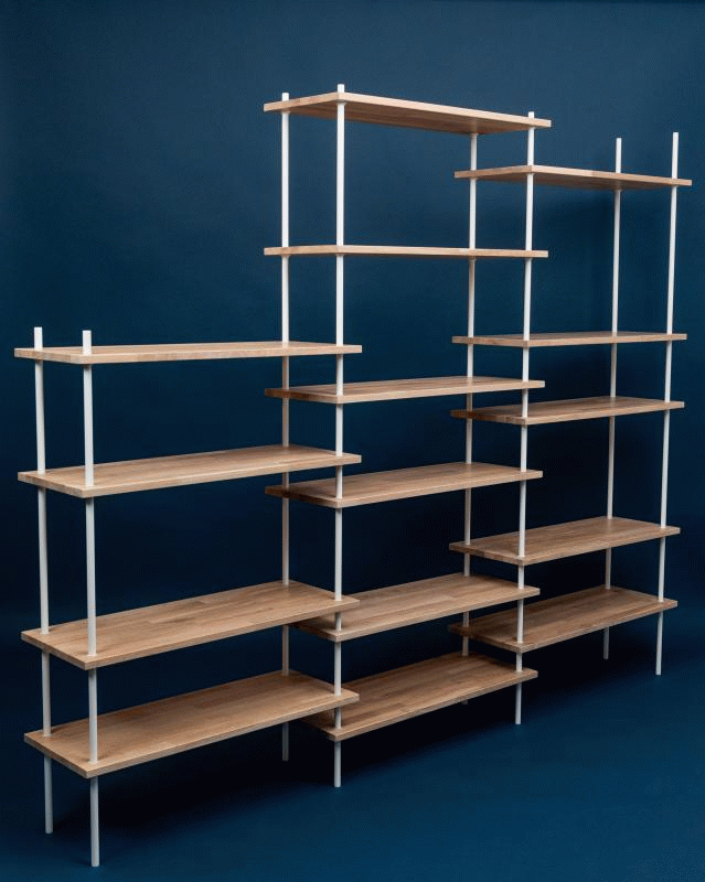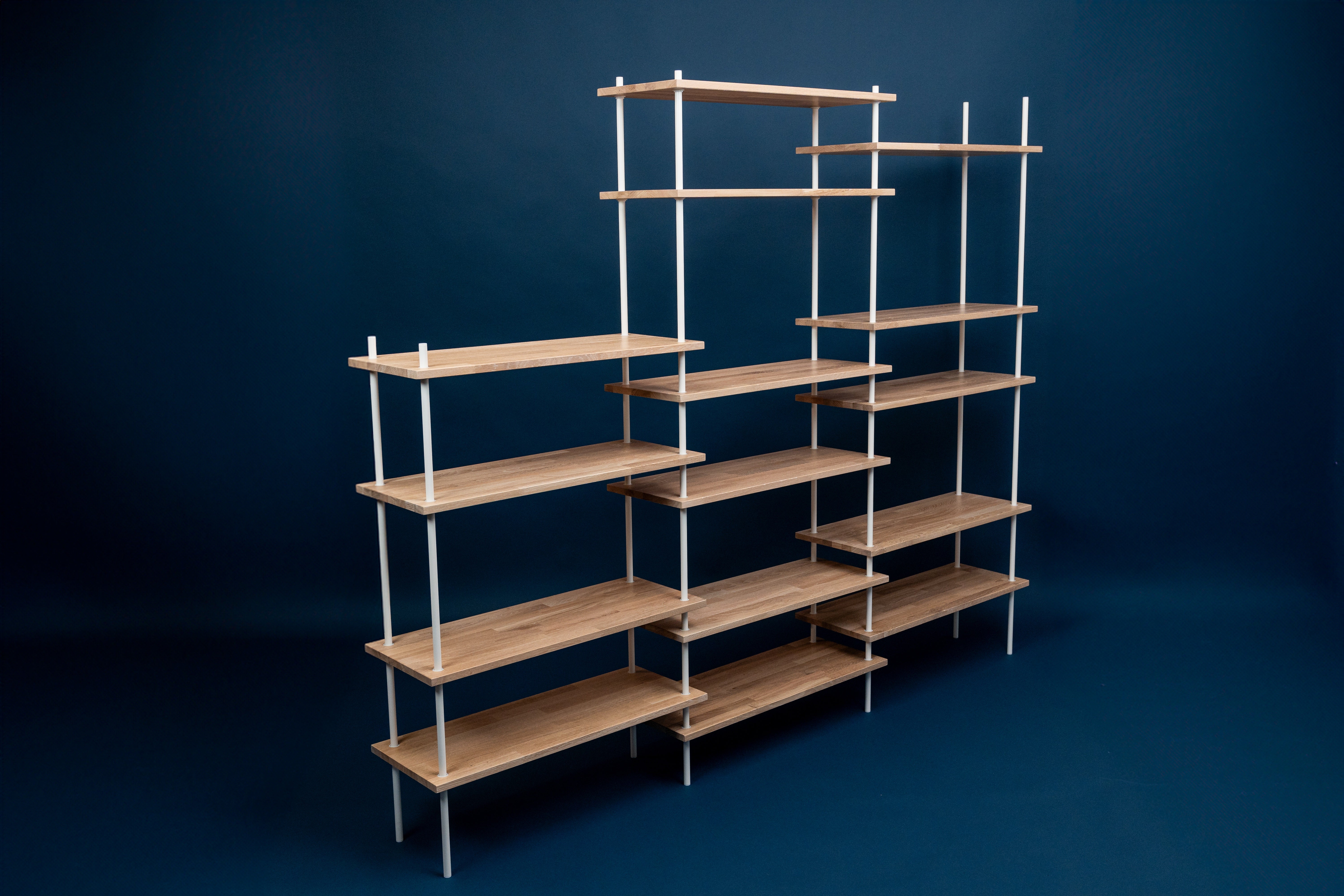 Cone Lock ist ein Systemregal aus Eichenholzböden, Stahlrohren und 3D-gedruckten Verbindungselementen. Die Verbindungselemente sind spreizbare Hülsen und Rundkeile, die konisch ineinander passen. Die Hülsen werden in Löcher der Regalböden gesteckt, die Rundkeile auf die Rohre. Der Aufbau gelingt leicht und schnell: 4 Keile werden an 4 Rohren positioniert. Ein Boden wird aufgefädelt und hält allein durch die Keilwirkung seine Position! Zum dauerfesten Verschließen jeder einzelnen Verbindung wird der Keil mit einem "Schieber" fest in die Hülse eingeschoben, bis sie nahezu unsichtbar zwischen Boden und Rohr verschwindet. Die Summe aller Verbindungen bewirkt ein enorm stabiles Regal, ohne jede Querverstrebung oder Verschraubung. Insgesamt ergibt sich ein sehr minimalistisches und reines Konstrukt, welches sehr hohe Belastungen standhält. Die Regalböden lassen sich durch einfaches Hochdrücken wieder lösen und der gesamte Rückbau gelingt in wenigen Minuten. Die Kombination aus symmetrischen Regalböden und dieser stufenlos einstellbaren Verbindungstechnik ermöglichen unzählige Aufbauvarianten - gerade, oder ums Eck. Fertigungstechnik, Materialauswahl, Recyclingpotential und Modularität machen das Cone Lock Systemregal zu einem außerordentlich langlebigen und nachhaltigen Produkt.